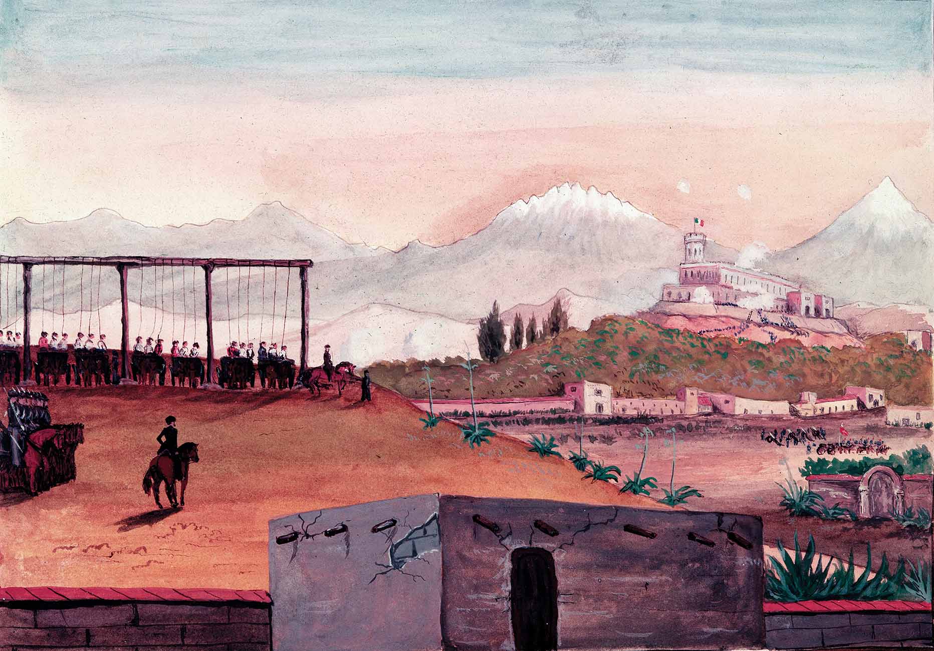 At dawn on September 13, 1847, the San Patricios, their hands and feet bound, were made to stand in the hot sun in sight of Chapultepec, the last Mexican fortress protecting Mexico City. They were forced to watch the battle unfold. When the American troops scaled the walls of the fortress and raised the U.S. flag, the San Patricios were all hanged simultaneously.
