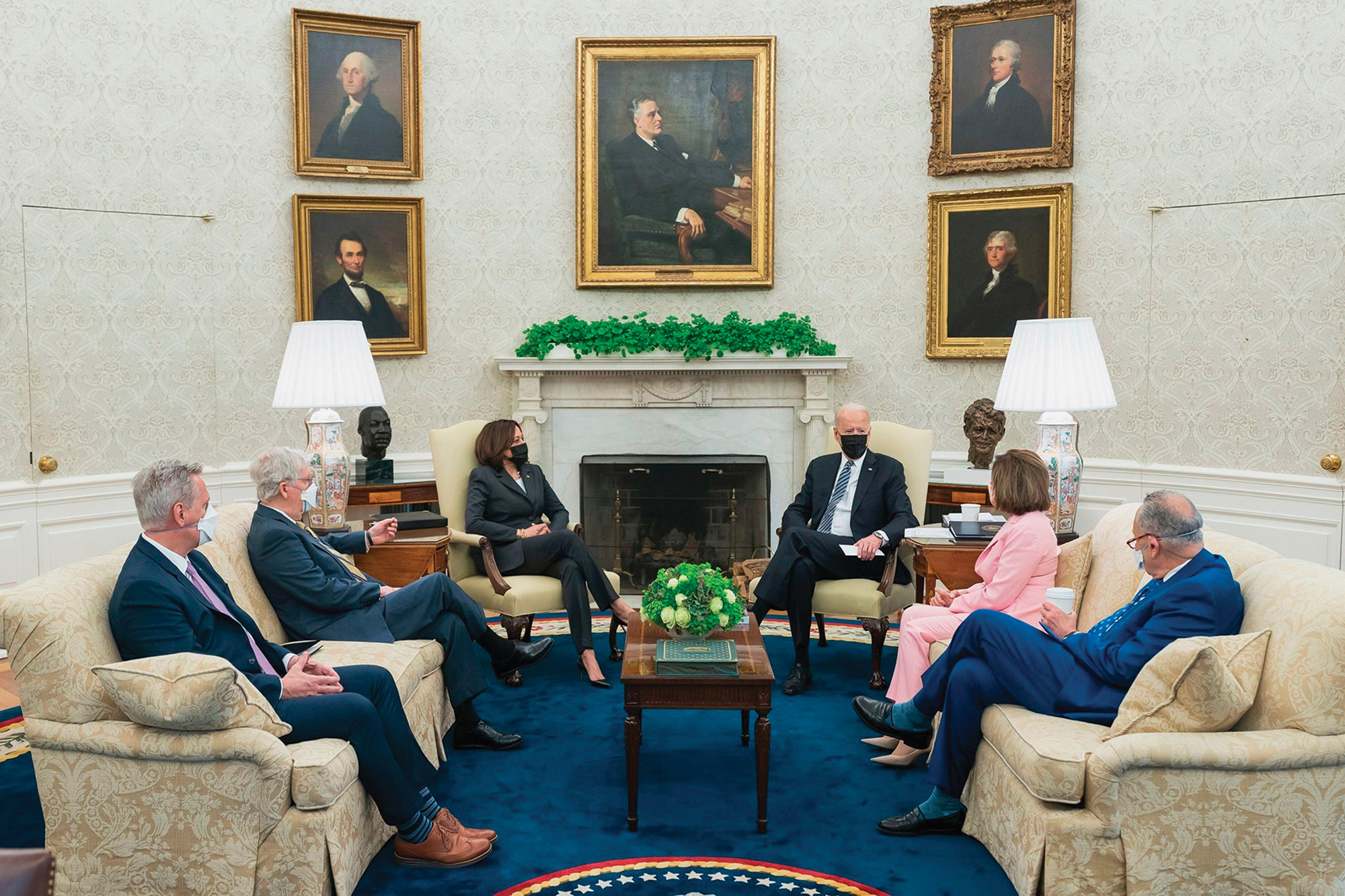 The system of checks and balances ensures that political power is shared by the separate institutions. Here, President Biden meets with the 117th Congress leadership, including Senate Minority Leader Mitch McConnell, Senate Majority Leader Chuck Schumer, and House Speaker Nancy Pelosi.