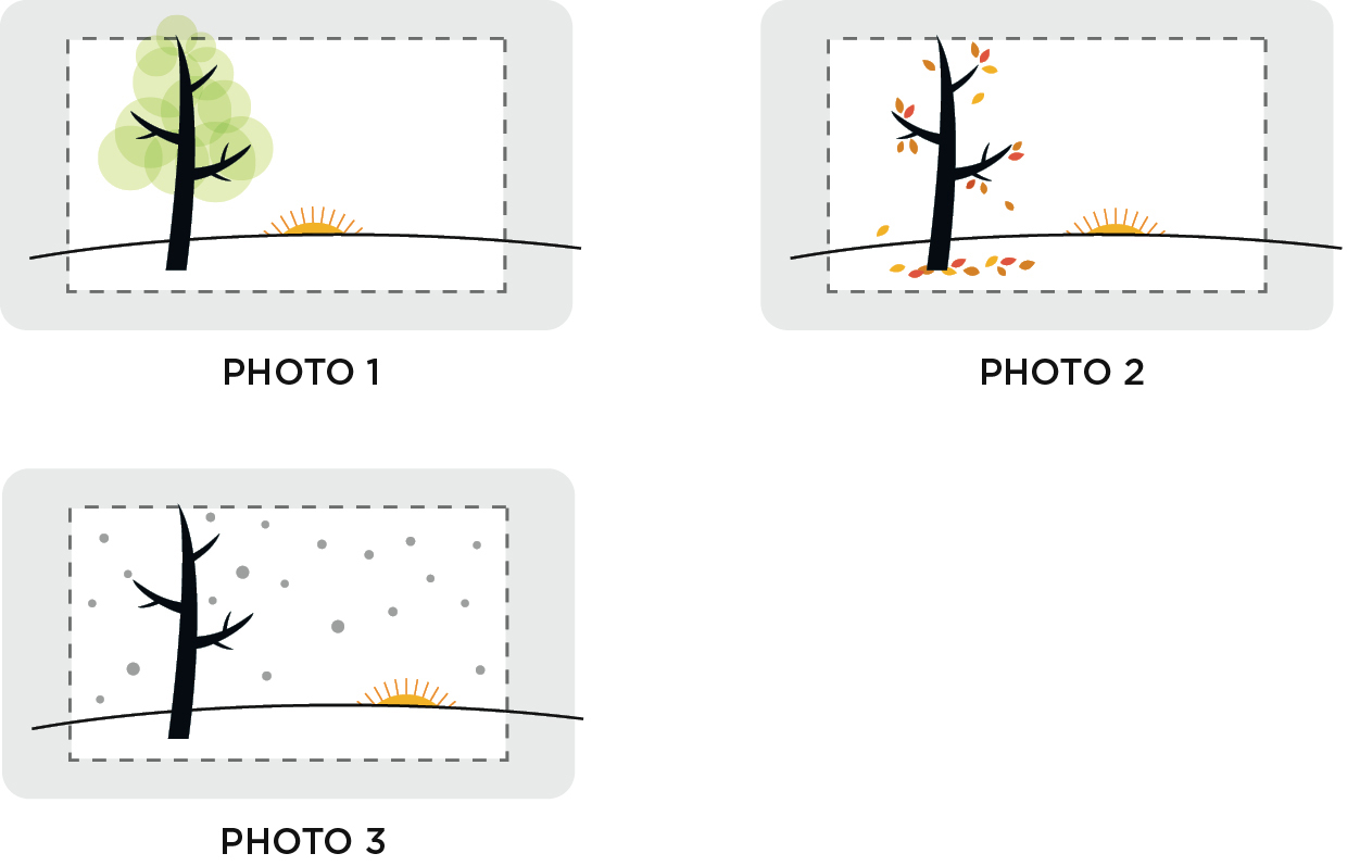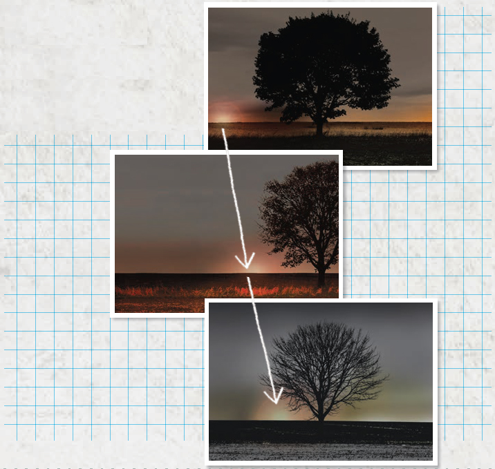 Go to the same location and take three photos of the horizon at a time of day when the Sun is just below the horizon. Be sure that you have a stationary object (like a tree) in each photo. Take a photo at: