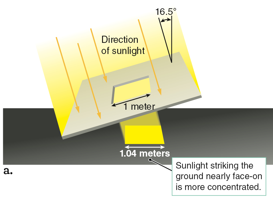 The changing length of days through the year only partly explains seasonal temperature changes. A more important effect relates to the angle at which the Sun’s rays strike Earth. The Sun is higher in the sky during summer than during winter, and sunlight strikes the ground more directly during summer than during winter. To see why that is important, study Figure 2.15. During summer, Earth’s surface is more nearly face-on to the incoming sunlight. The light is concentrated and bright so more energy falls on each square meter of ground each second. During winter, the surface is more tilted with respect to the sunlight, so the light is more diffuse. Less energy falls on each square meter of the ground each second. For example, at latitude 40° north, which stretches across the United States from northern California to New Jersey, more than twice as much solar energy falls on each square meter of ground per second at noon on June 20 as falls there at noon on December 21. That variation is the main reason why summer is hotter and winter is colder.