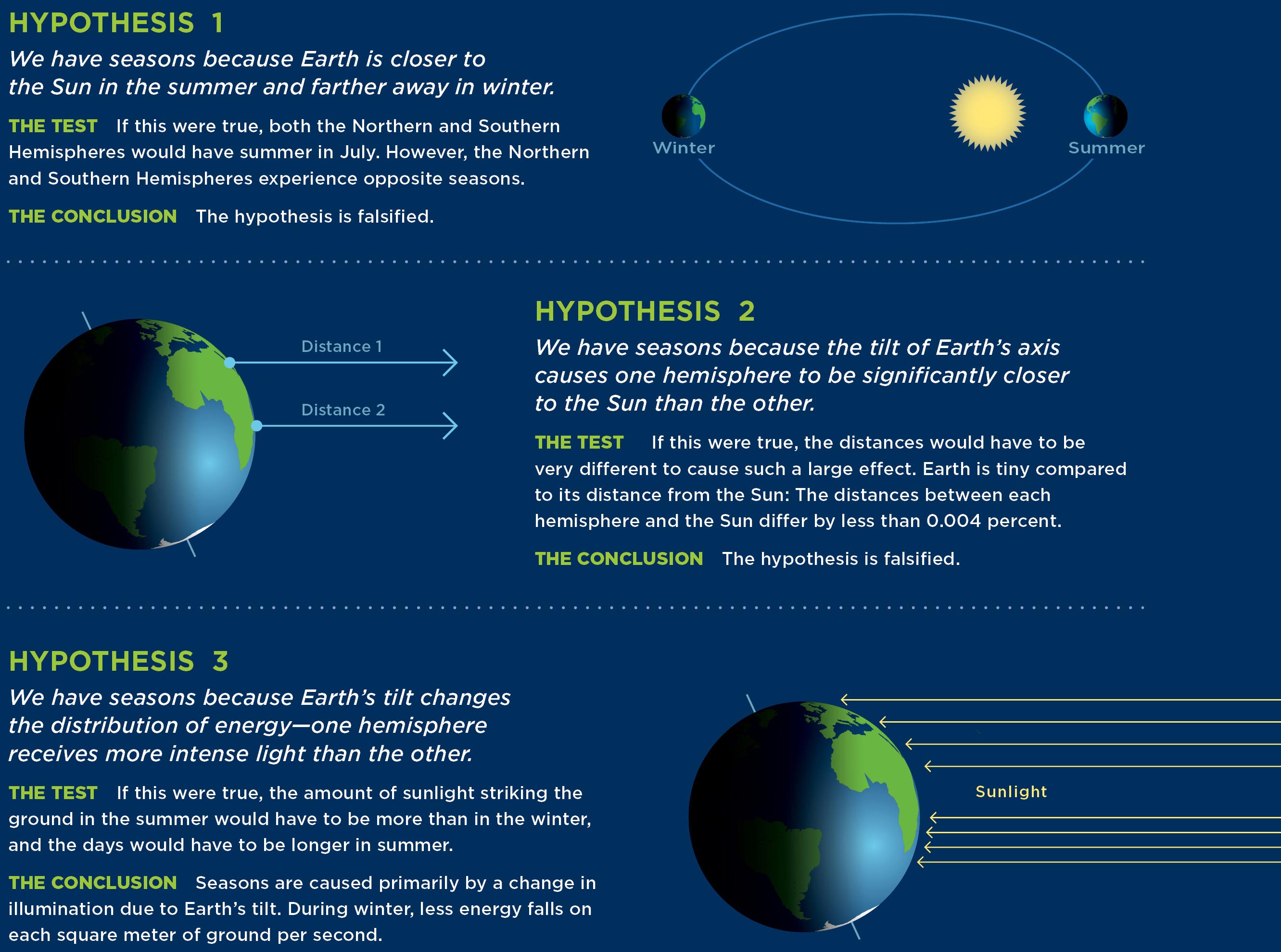 The Process of Science Figure demonstrates how determining the causes of seasonal change requires accounting for all the known facts. The two effects of Earth’s tilted axis—the directness of sunlight and the different lengths of the night—mean that the Sun heats a hemisphere more at one time of year than another, causing summer and winter.