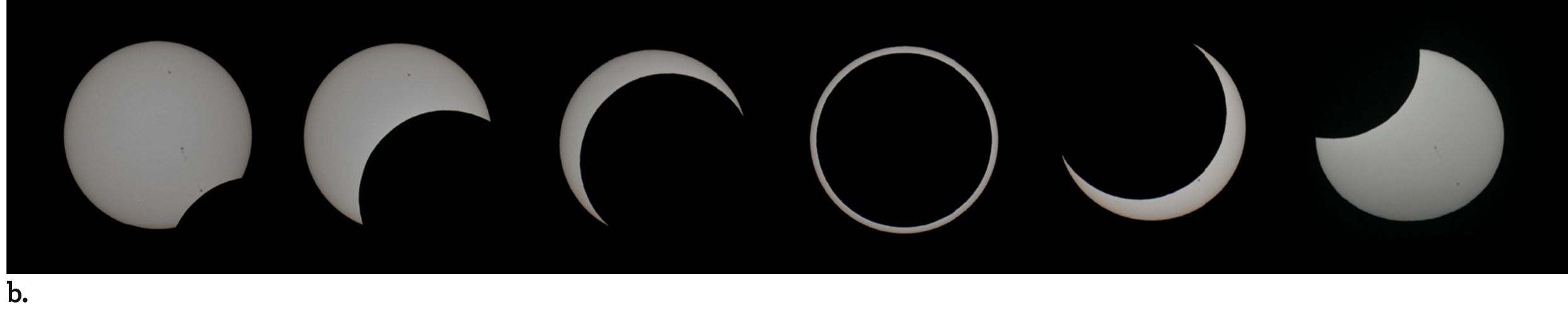 A penumbral lunar eclipse occurs when the Moon passes through the penumbra of Earth’s shadow; those are noticeable only from a very dark location or when the Moon passes within about 1000 km of the umbra. If Earth’s shadow incompletely covers the Moon, some of the Moon’s disk remains bright and some of it is in shadow. The result is a partial lunar eclipse. Figure 2.30b shows a composite of images taken at different times during a partial lunar eclipse. In the middle frame, Earth’s shadow nearly completely eclipses the Moon.