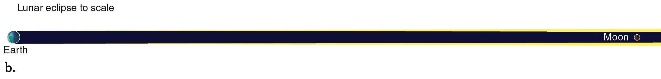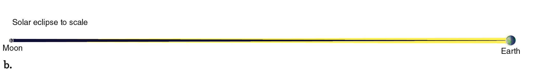 Figure 2.27 shows the geometry of a solar eclipse when the Moon’s shadowfalls on Earth’s surface. Figures like this one usually show Earth and the Moon much closer together than they really are. The page is too small to draw them to scale and still show the critical details. The relative sizes and distances between Earth and the Moon are roughly equivalent to the difference between a basketball and a tennis ball, respectively, placed 7 meters apart. Figure 2.27b shows the geometry of a solar eclipse with Earth, the Moon, and the separation between them drawn to scale. Compare that drawing with Figure 2.27a to see why drawings of Earth and the Moon are rarely drawn to scale. If the Sun were drawn to scale in Figure 2.27a, it would be bigger than your head and located almost 64 meters off the left side of the page.