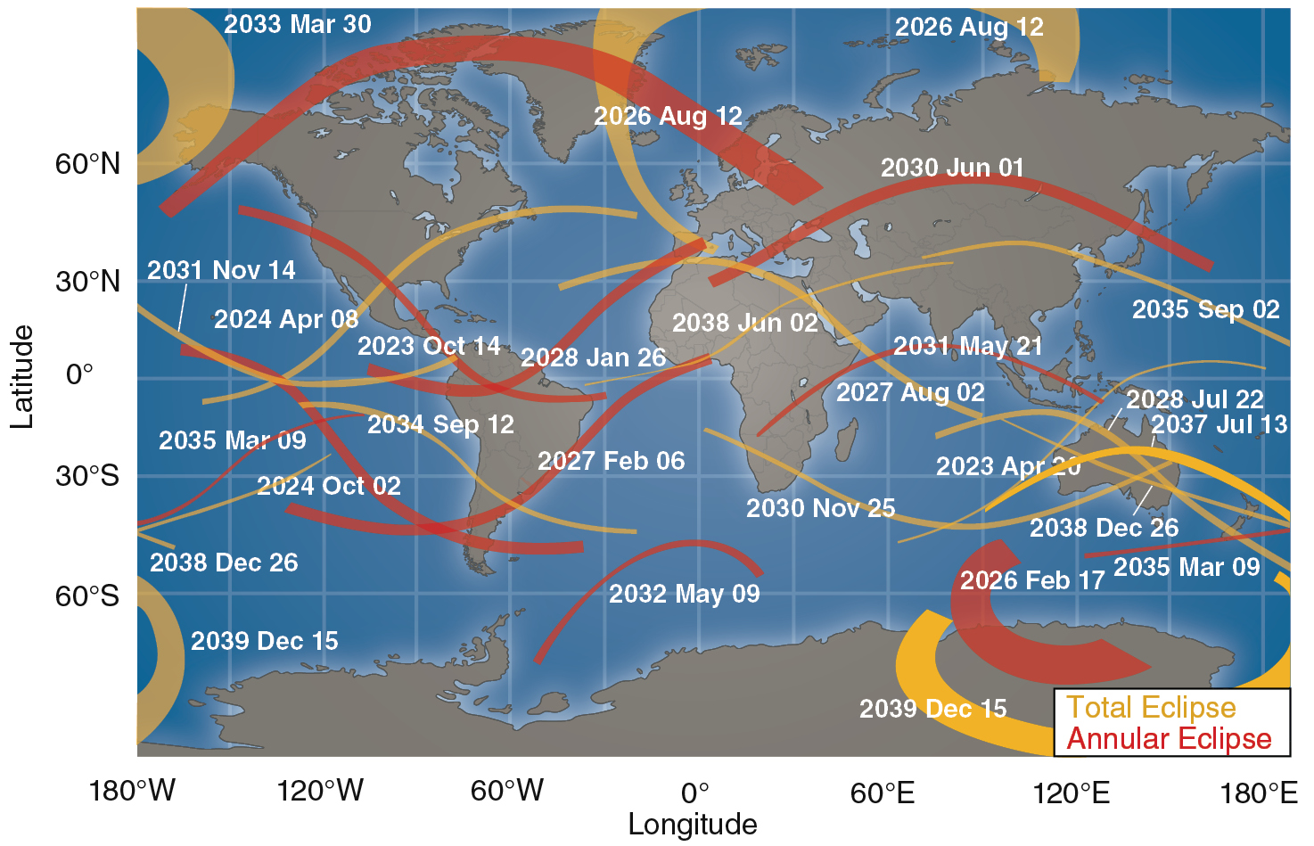 As a result of those factors, a total solar eclipse can never last longer than 71⁄2 minutes and is usually significantly shorter. Even so, it is one of the most amazing sights in nature. People all over the world flock to the most remote corners of Earth to witness the fleeting spectacle of the bright disk of the Sun blotted out of the daytime sky. Perhaps you saw the total eclipse visible from much of the United States in August 2017. The next total solar eclipse visible in the continental United States will take place in 2024. Annular eclipses will be visible from parts of the United States in 2021 and 2023. Viewing a solar eclipse should be on your lifetime to-do list!