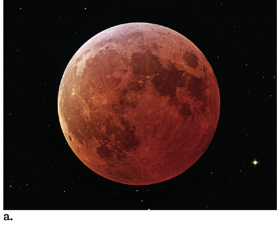 Lunar eclipses occur when the Moon moves through Earth’s shadow. Figure 2.29a shows the geometry of a lunar eclipse and is drawn to scale in Figure 2.29b. During a lunar eclipse, Earth is between the Sun and the Moon. Because Earth is much larger than the Moon, the dark umbra of Earth’s shadow at the distance of the Moon is more than 2 times the Moon’s diameter. A total lunar eclipse, in which the Moon is entirely within Earth’s shadow, lasts as long as 1 hour 40 minutes. In a total lunar eclipse, the Moon often appears red (Figure 2.30a). That “blood-red Moon,” as literature and poetry have called it, occurs because red light from the Sun is bent as it travels through Earth’s atmosphere and then illuminates the Moon. Earth’s atmosphere absorbs or scatters other colors of sunlight away from the Moon and therefore does not illuminate it.