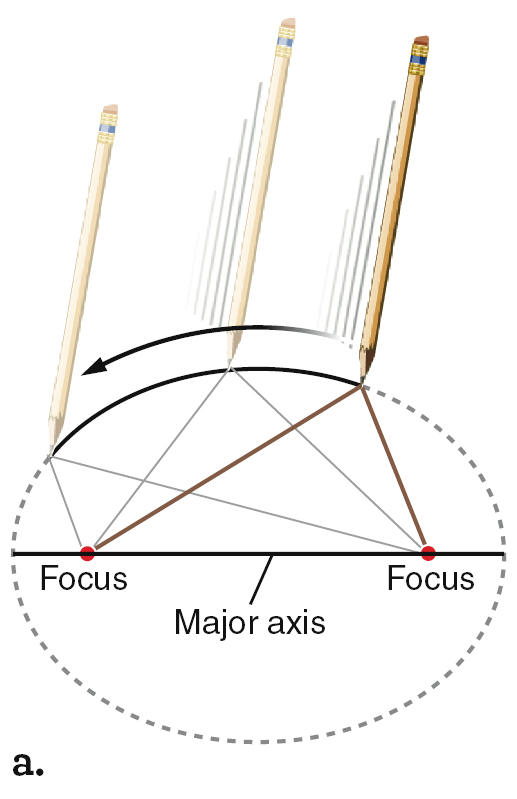 By replacing Copernicus’s circular orbits with elliptical orbits, Kepler could predict the positions of planets for any day, and his predictions fit Tycho’s observations almost perfectly. An ellipse is an oval that is symmetric from right to left and from top to bottom. As shown in Figure 3.12a, you can draw an ellipse by attaching the two ends of a piece of string to a piece of paper, stretching the string tight with the tip of a pencil, and then drawing around those two points while keeping the string tight. Each point at which the string is attached to the paper is a focus (plural: foci) of the ellipse. If the two foci are close together, then the ellipse is more circular (Figure 3.12b). If the two foci are farther apart, the ellipse is more elongated. The long axis of the ellipse is called the major axis, and the short axis is called the minor axis. The eccentricity (e) of an ellipse measures that elongation; it is determined by the distance from the center of the ellipse to a focus, divided by half the length of the major axis. A circle has an eccentricity of 0 because the two foci coincide at the center. The more elongated the ellipse becomes, the closer its eccentricity gets to 1.
