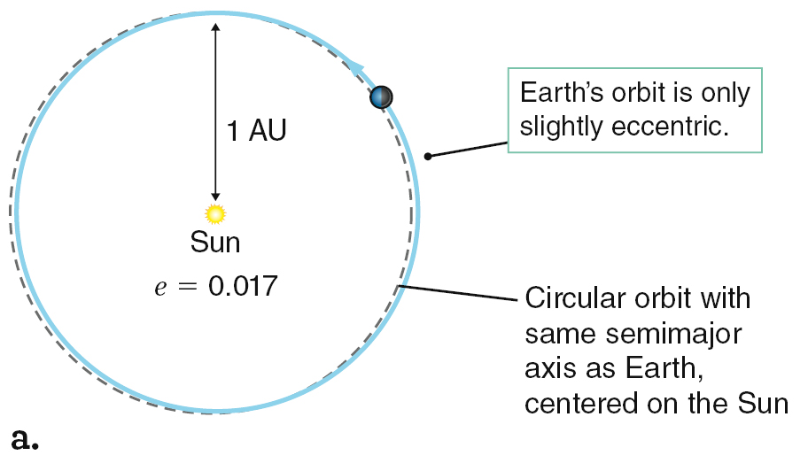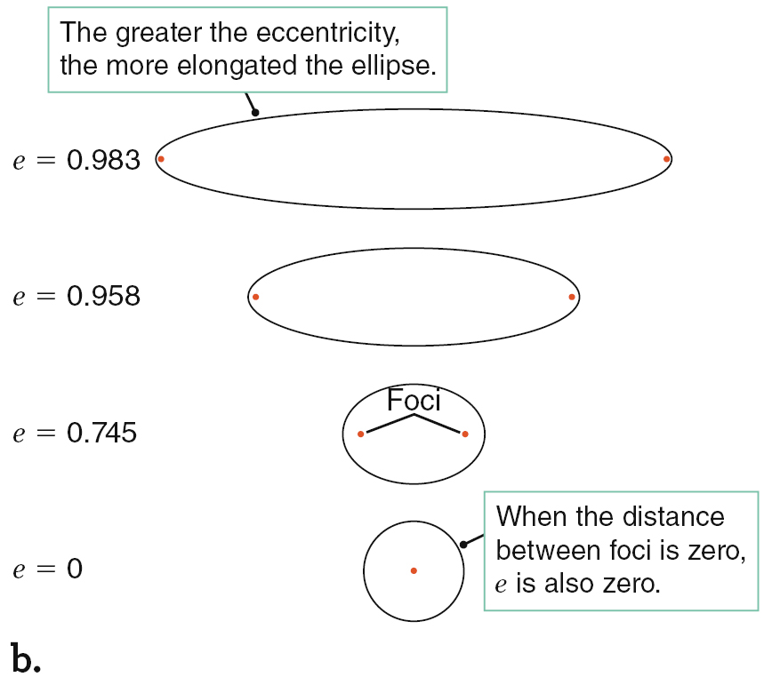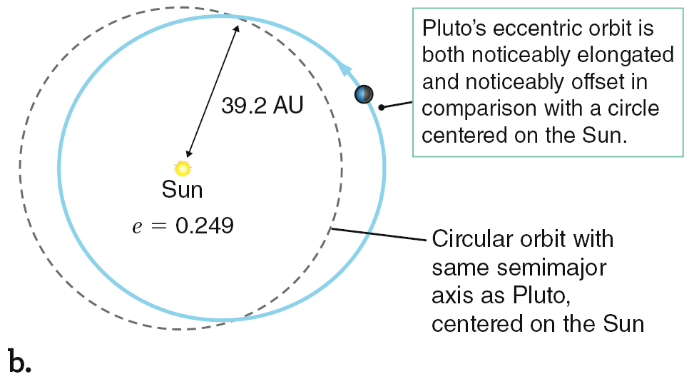 Most planetary objects in our Solar System have nearly circular orbits (that is, they are ellipses with very low eccentricities). As Figure 3.14a shows, Earth’s orbit, with an eccentricity of 0.017, is very nearly a circle centered on the Sun; therefore, the variation in distance between Earth and the Sun is small. In contrast, dwarf planet Pluto’s orbit (Figure 3.14b) has an eccentricity of 0.249. The Sun is noticeably offset from center, and the orbit is elongated.