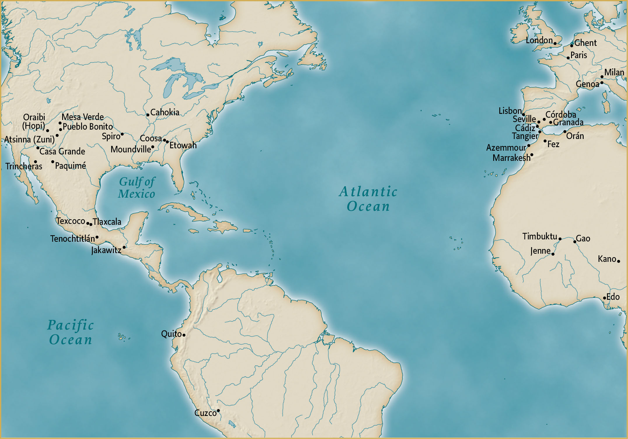 The Americas, Western Europe, and West Africa on the eve of colonization. There were countless human settlements on all four continents. People lived on farms, in villages and towns, and in cities, including the cities marked on the map.