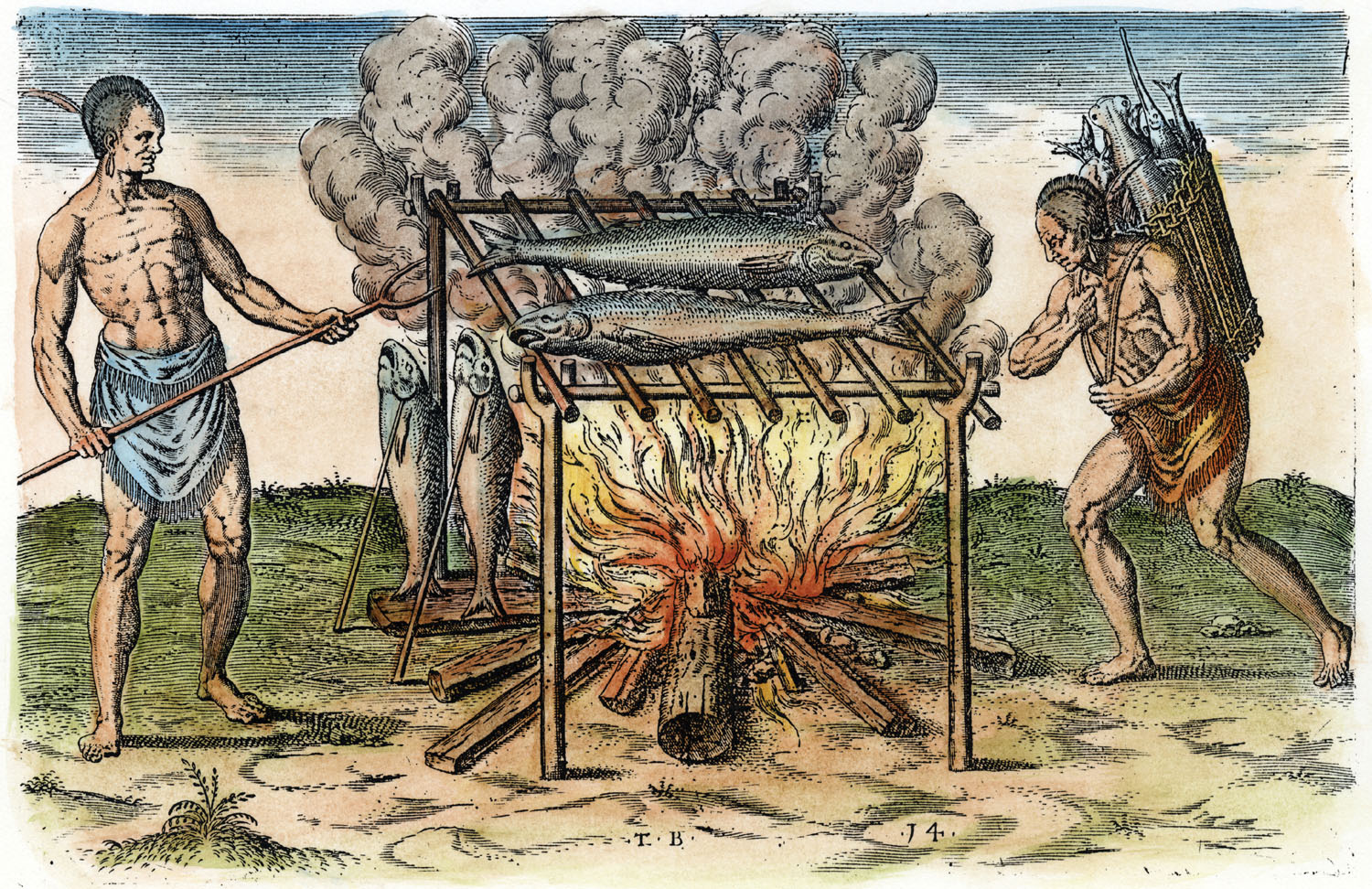 This engraving shows Native men of Ossomocomuck (present-day coastal North Carolina) cooking fish they caught off the Outer Banks.
