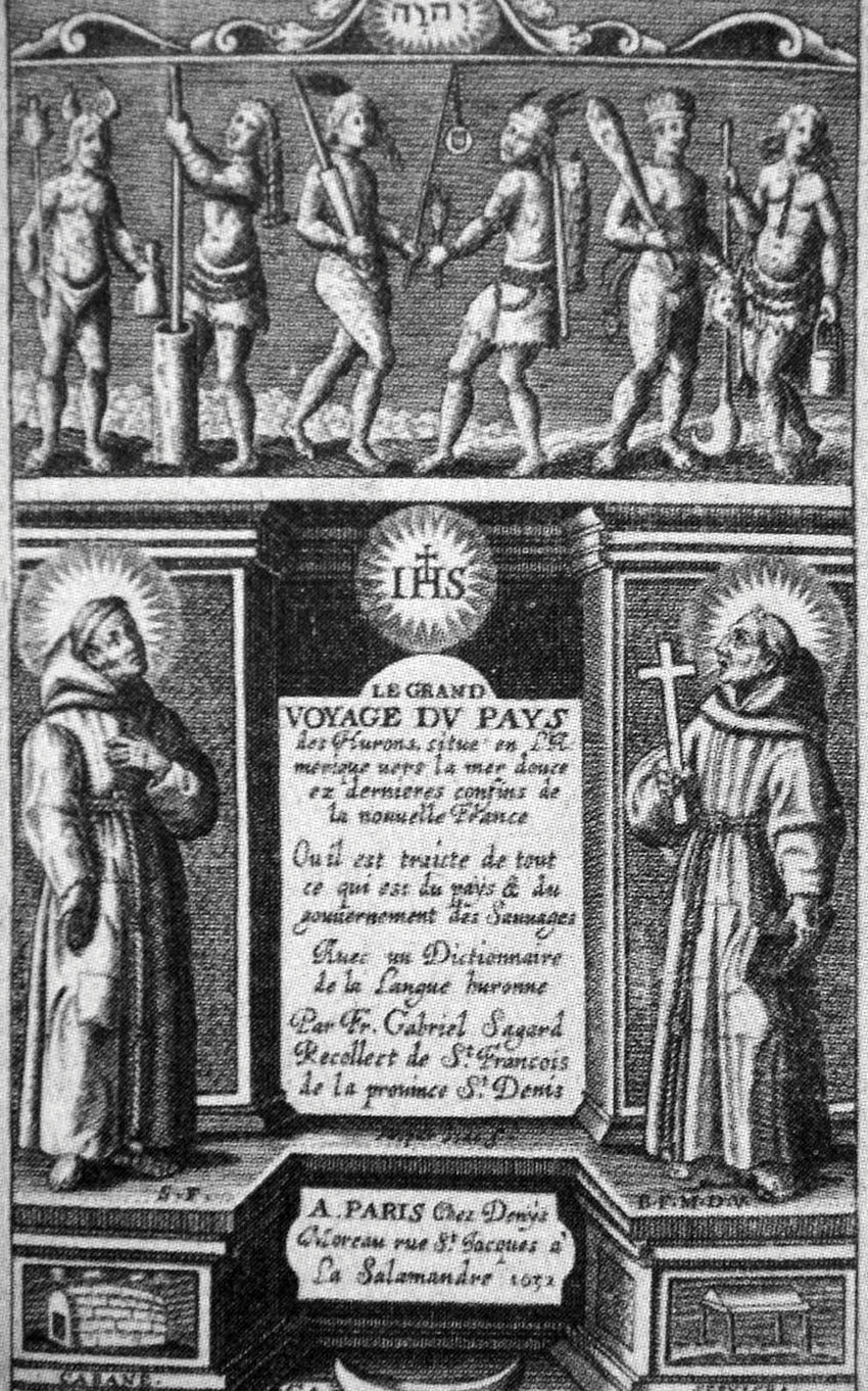 The title page of The Great Voyage to the Country of the Hurons, published in Paris in 1632 by Gabriel Sagard, one of the first missionaries to New France, includes images of Native Americans and Catholic friars. Father Sagard also produced a dictionary of the Huron (Wendat) language.