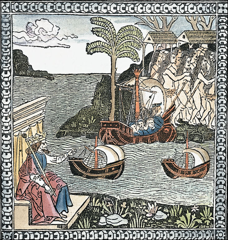 On October 12, 1492, the Taíno (Arawak) people on one of the islands that today are called the Bahamas saw a strange sight. They were accustomed to vessels approaching from far away, but these ships were built in an unusual shape and had sails. The men wore armor made of metal and spoke in an unfamiliar language. These strangers did seem at least to know how to trade, and their needles and other pieces of metal seemed interesting and useful.