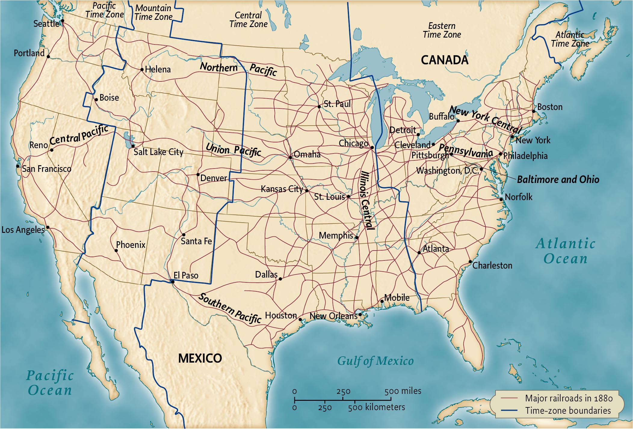 The railroad made possible what is sometimes called the “second industrial revolution.” Spurred by private investment and massive grants of land and money by federal, state, and local governments, the number of miles of railroad track in the United States tripled between 1860 and 1880 and tripled again by 1920, opening vast new areas to commercial farming and creating a truly national market for manufactured goods. In 1886, the railroads adopted a standard national gauge (the distance separating the two rails), making it possible for the first time for trains of one company to travel on any other company’s track. By the 1890s, five transcontinental lines transported the products of western mines, farms, ranches, and forests to eastern markets and carried manufactured goods to the West. The railroads reorganized time itself. In 1883, the major companies divided the nation into the four time zones still in use today.