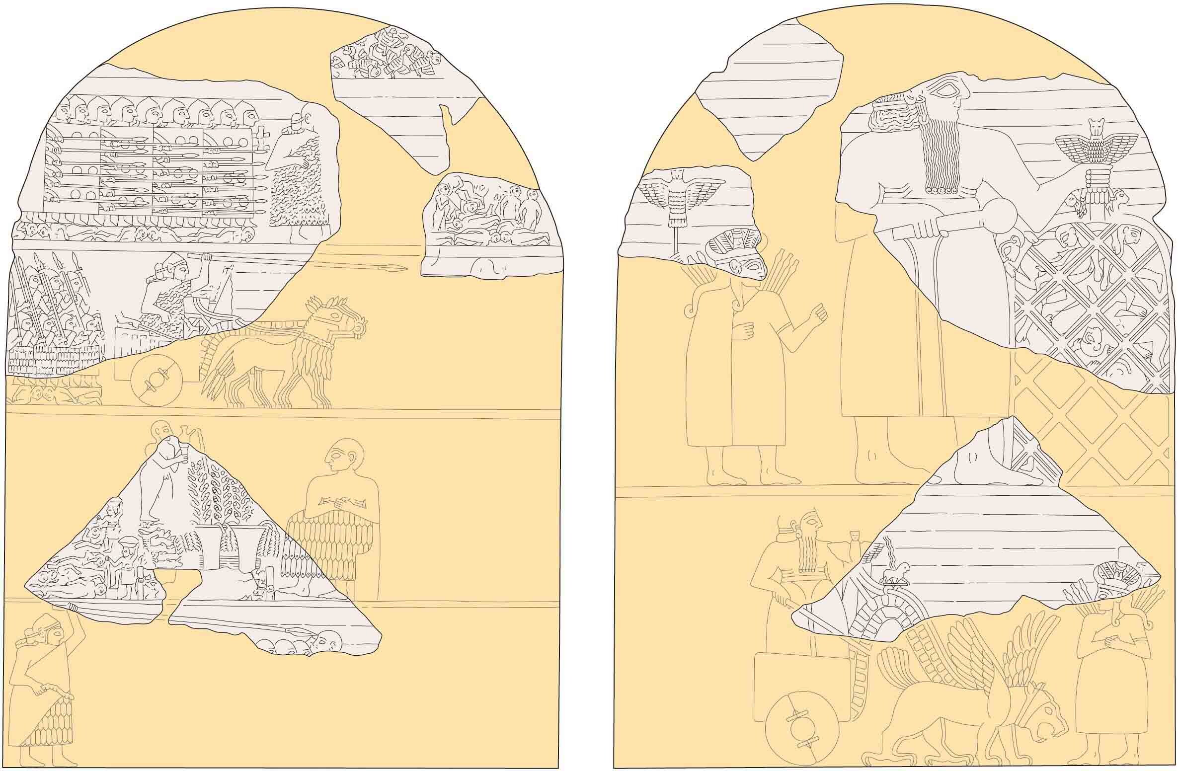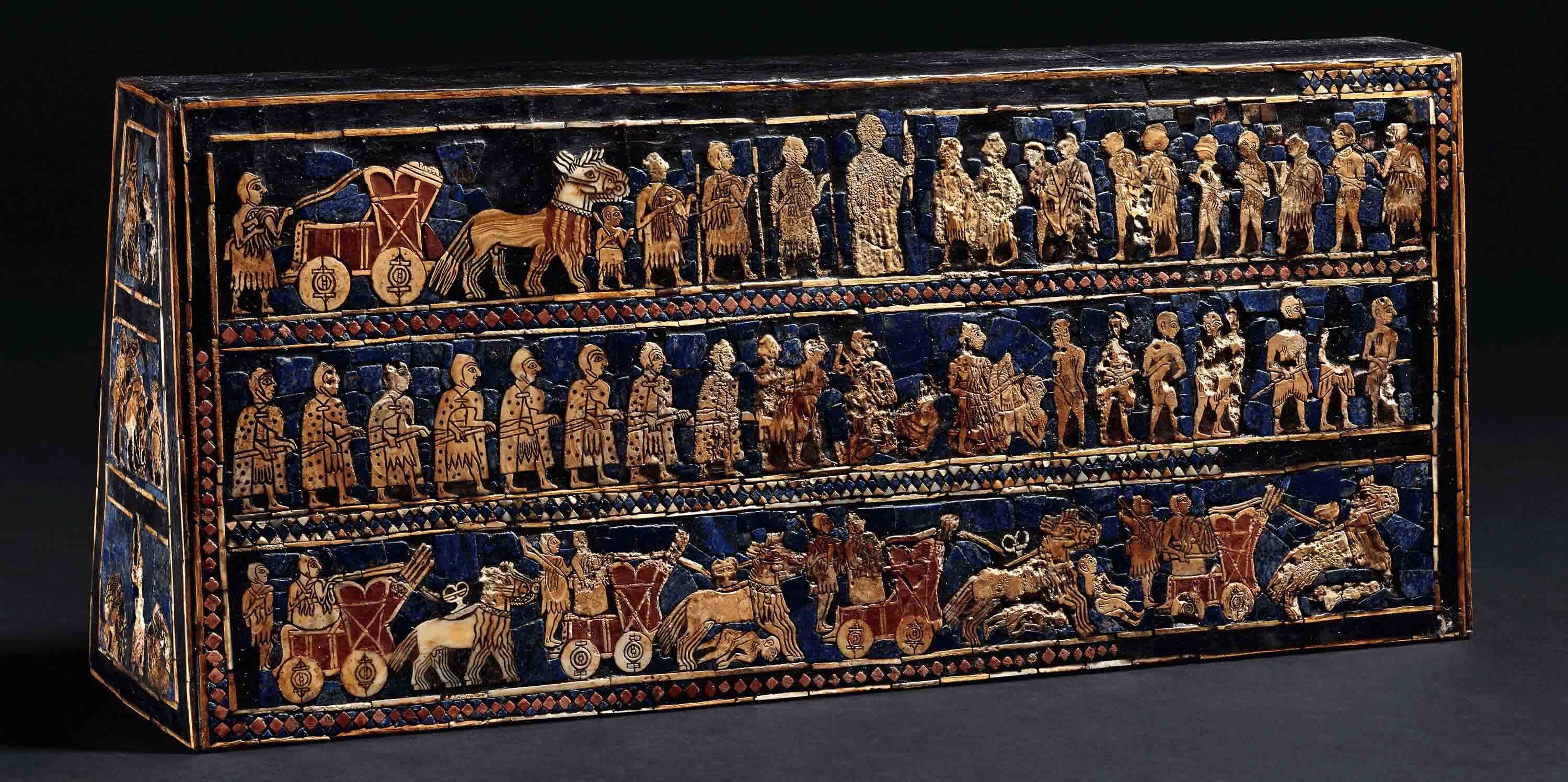 Whatever its function, the standard provides an early example of a pictorial narrative in which political conflict, war, and feasting are linked in a cause-and-effect relationship. Each of its two main faces depicts different episodes in a narrative divided into three horizontal registers, with concluding scenes on the top register. One face depicts a battle and the subsequent capture of prisoners of war, who are then presented to a person of high status (Fig. 3.12a). In the bottom register, chariots, each drawn by four onagers (a species of wild ass or horse), trample over the naked bodies of defeated enemies. The scene continues in the middle register with a group of armed soldiers taking their naked enemies prisoner. In the top register, the captives are presented to the centrally placed ruler. The use of hierarchical scale depicts him as slightly taller than the others, and his dominant position in the scene suggests his status as a leader. Accompanying him are courtiers holding instruments. The chariot at the far left is perhaps reserved for the ruler.