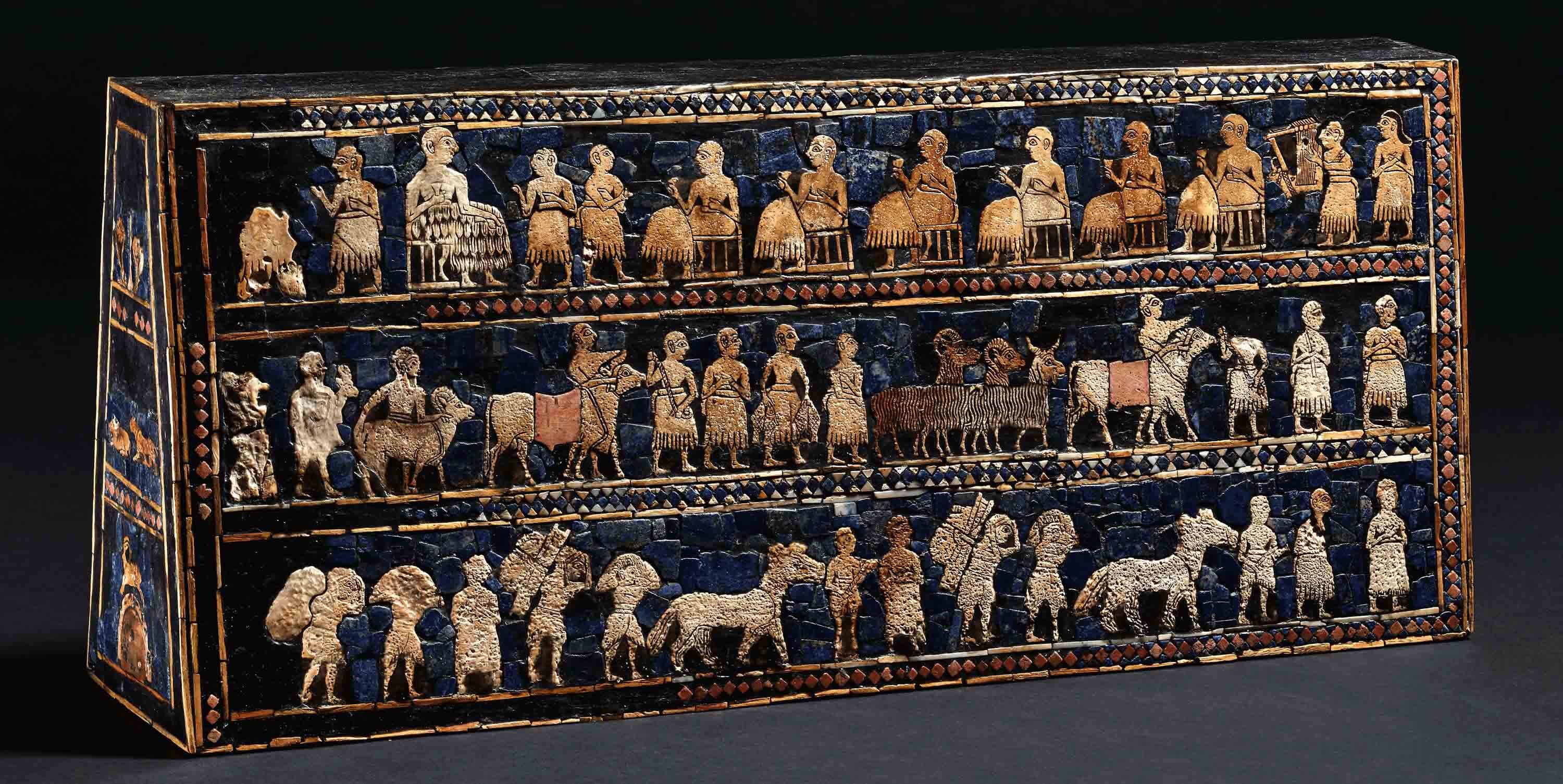 The standard’s other main face also depicts people moving across the three registers. On the top register, the narrative involves a celebration in the form of a banquet (Fig. 3.12b). One figure, slightly larger than the others, dominates the scene. He is seated, holding a cup and wearing the ceremonial flounced skirt that is common in representations of elite people in early Mesopotamian art (see Fig. 3.11, for example). He is facing the other banqueters, who are entertained by what appear to be a lyre player and a singer on the far right. The lower two registers illustrate long processions of people bringing animals and various goods, perhaps as tribute to their ruler. Interestingly, the lyre’s front is decorated with a bull’s head similar to that from the Great Lyre of Ur (Fig 3.13.)