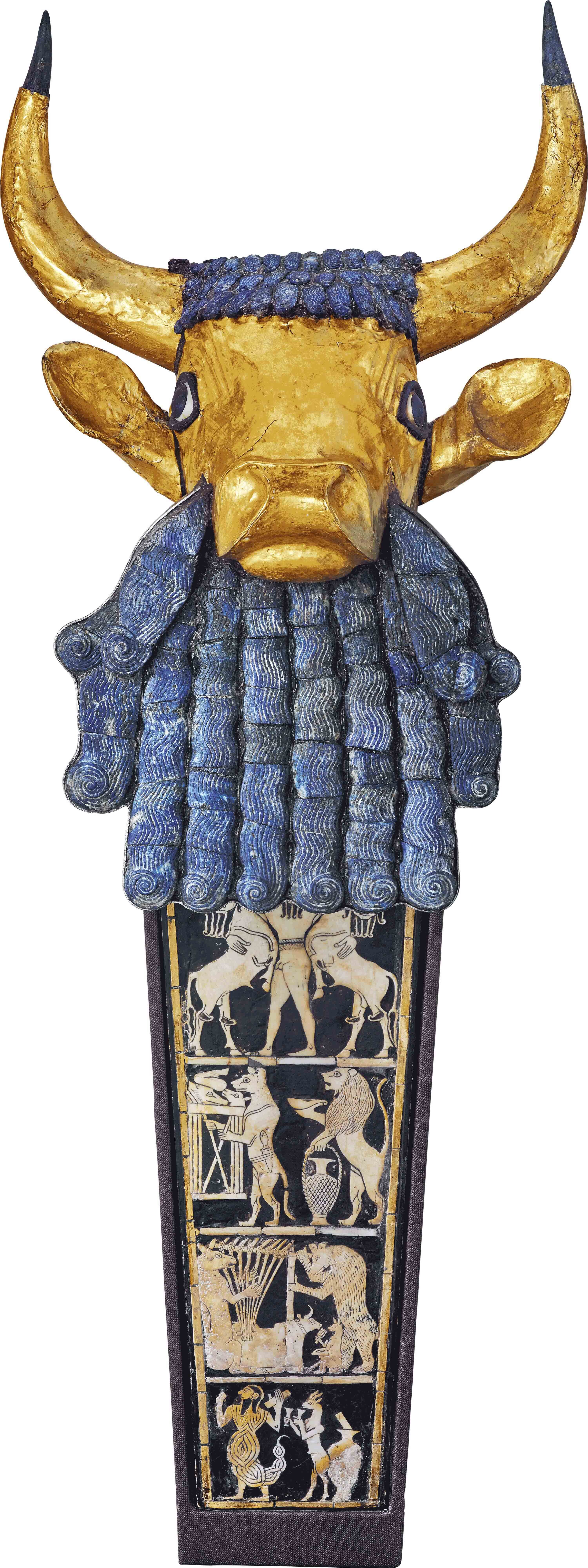 The front of the lyre has an inlaid base and is topped with a bearded bull’s head sheathed in gold. Below the bull’s head, four registers of narrative scenes are inlaid with shell on bitumen. These scenes depict animals engaged in activities normally associated with humans, such as butchering meat, carrying and pouring liquid from vessels, and playing musical instruments. In the top scene, a naked hero uses his arms to control two human-headed bulls who stare at the viewer. Taken together, the scenes seem to present either funerary rites or the afterlife in the underworld, but with animals taking on human roles.