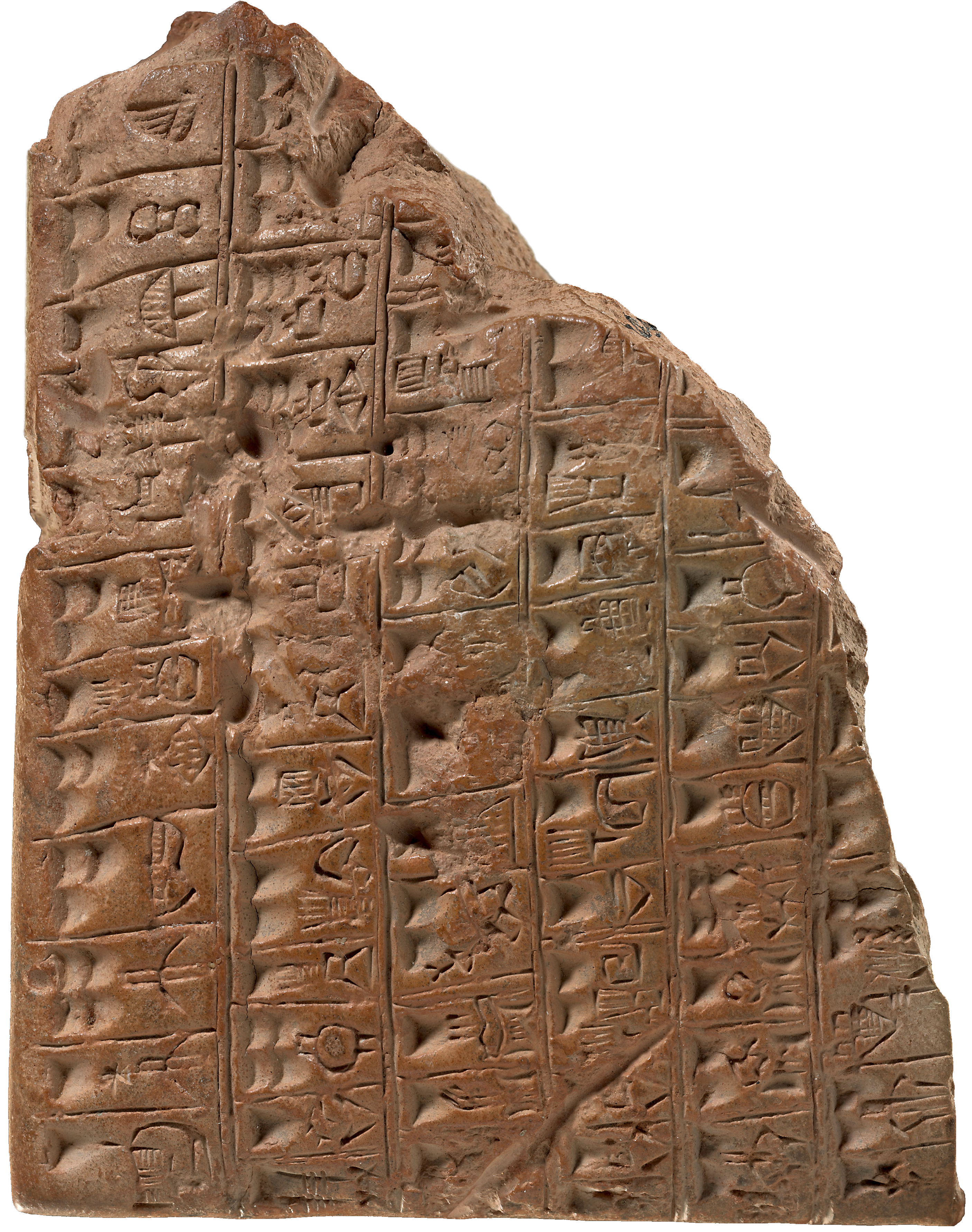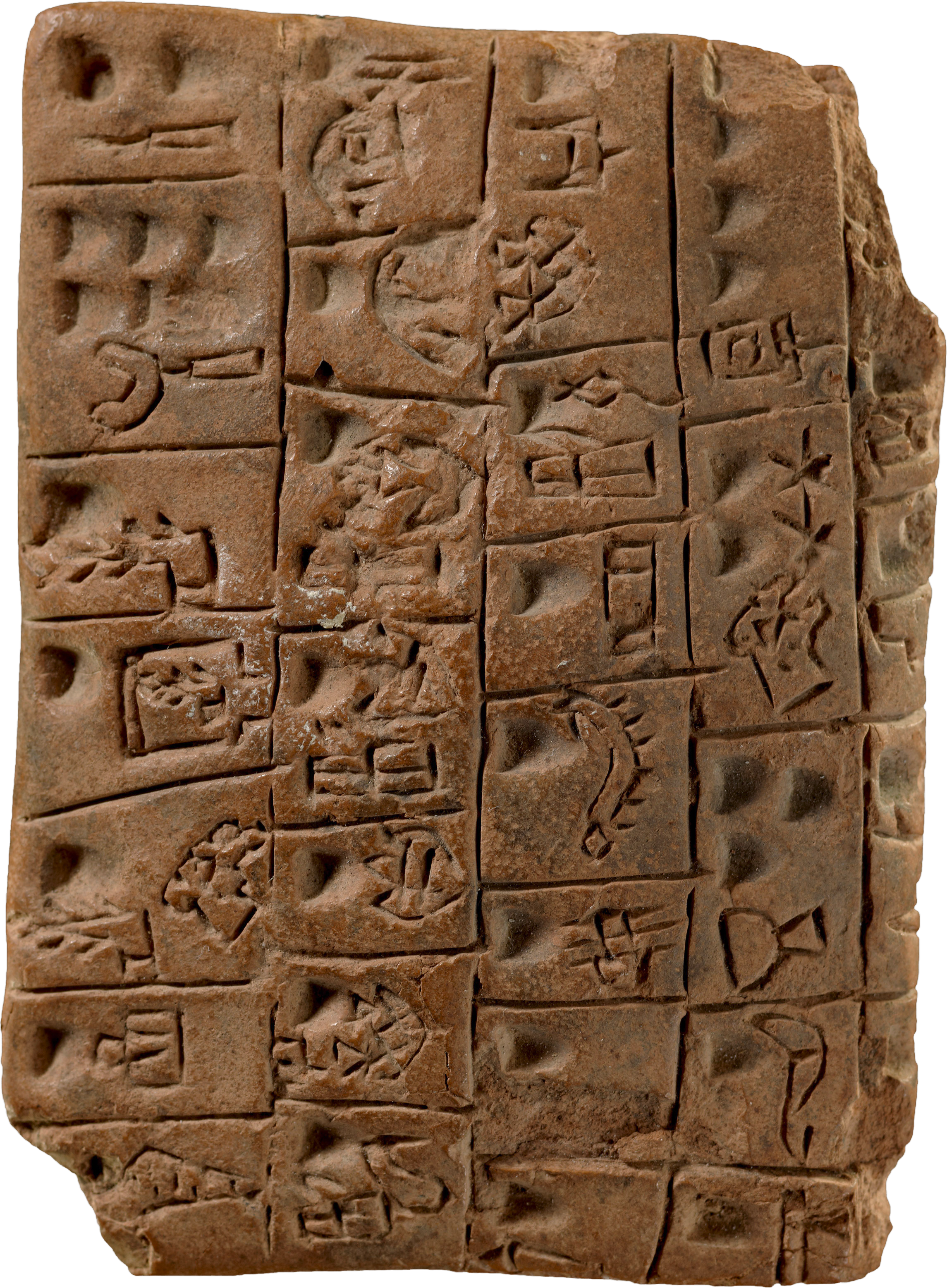 The earliest tablets from Uruk used a complex system of around nine hundred signs (see Fig 3.6). These signs include numbers or units of measurement, and pictograms or logograms (signs that represent and stand in for a whole word or a phrase). The pictograms drew heavily from representational elements found on seals and other media. Early in its development, therefore, writing derived substantially from pictures.