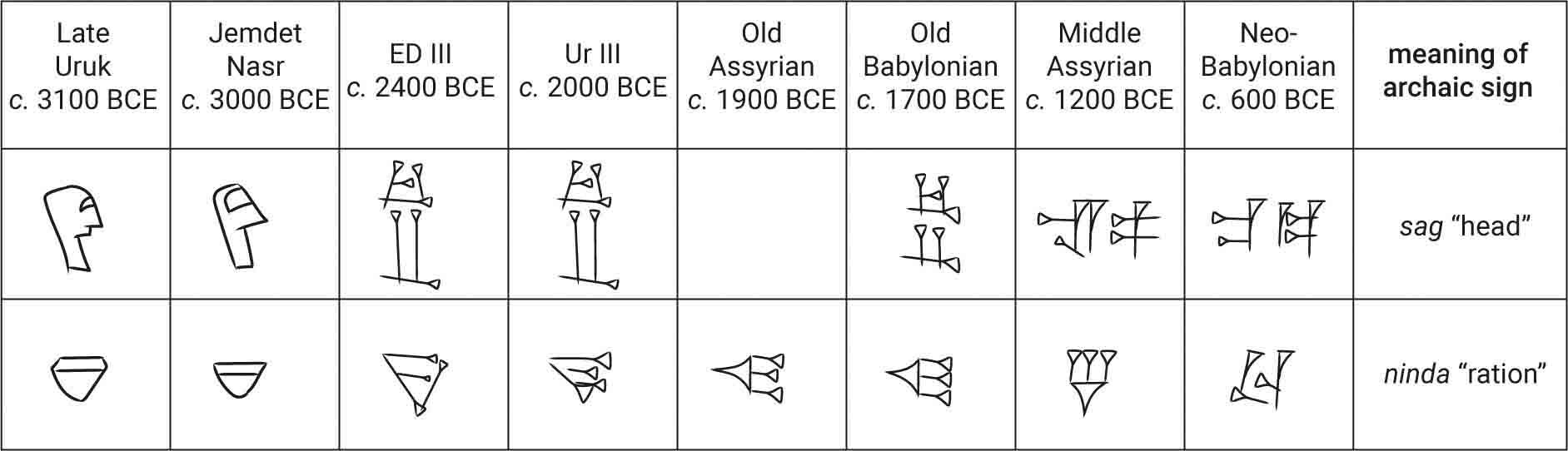 For example, as the chart shows (Fig. 3.7), when the ancient Sumerian language of southern Mesopotamia was first written down, a drawing of a human head stood for the word “head” (Sumerian sag), while a drawing of a bowl stood for “ration” (Sumerian ninda). As writing became more widespread and complex, pictograms gradually transformed into abstract glyphs, which were easier to write with a stylus. A glyph is a conventionalized representation that consistently stands for a word, syllable, or sound. In the most developed cuneiform writing systems, some glyphs stood for a complete word or a phrase, while others stood for syllables. That is, the latter were phonetic, or sound-based, signs.