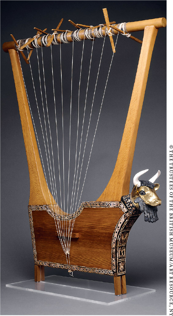 Archaeological remains and images are still crucial for understanding the music of this time. Pictures show how instruments were held and played and in what circumstances music was used, while surviving instruments reveal details of their construction. For example, archaeologists exploring the royal tombs at Ur, a Sumerian city on the Euphrates, found several lyres and harps, two kinds of plucked string instruments, as well as pictures of them being played, all from ca. 2500 BCE. In a lyre, the strings run parallel to the resonating soundboard, passing over a bridge that transmits their vibrations, and attach to a crossbar supported by two arms; in a harp, the strings are in a plane that is perpendicular to the soundboard, and the neck that supports them is attached directly to the soundbox. Figure 1.3 is a reconstruction of one of the instruments from Ur: a bull lyre, a distinctively Sumerian lyre whose soundbox features a bull’s head, which had religious significance. Figure 1.4 is part of an inlaid panel depicting a musician playing a bull lyre at a victory banquet. The player holds the lyre, supported by a strap around his neck, perpendicular in front of him and plays it with both hands. Together image and instrument reveal that the lyre had a variable number of strings running from a bridge on the soundbox to the crossbar, where they were knotted around sticks that could be turned to change the tension and thus the tuning of each string. Other instruments of the period included lutes, pipes, drums, cymbals, clappers, rattles, and bells.