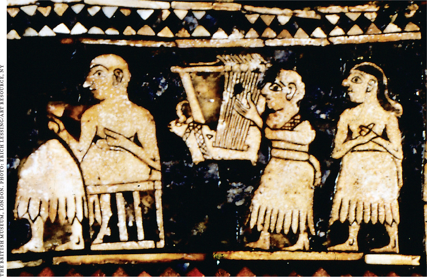 FIGURE 1.4Inlaid panel from Ur, ca. 2600 BCE, showing a bull lyre being played at a victory banquet.
