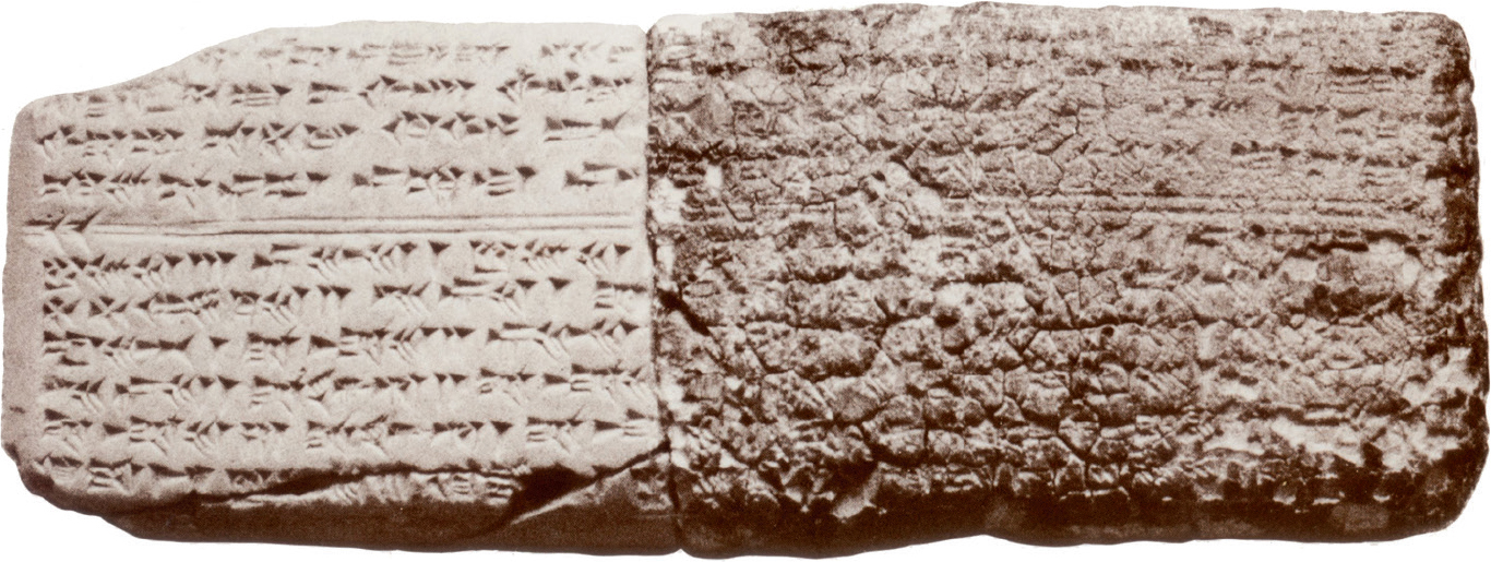 FIGURE 1.5Clay tablet from Ugarit, ca. 1400–1250 BCE, with text and musical notation for a hymn to Nikkal, a wife of the moon god. The words are written above the double line, the music below. DAMASCUS NATIONAL MUSEUM. PHOTO: DR. ANNE KHMER
