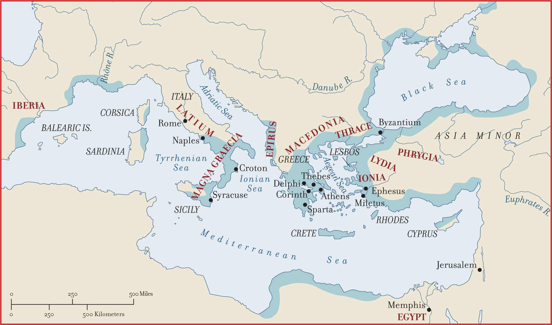 FIGURE 1.6Greece and Greek settlements about 550 BCE (shown in blue). The main centers of Greek population and culture were the Greek peninsula, the Aegean Islands, the west coast of Asia Minor (modern Turkey), and southern Italy and Sicily, known to the Romans as Magna Graecia (Greater Greece).
