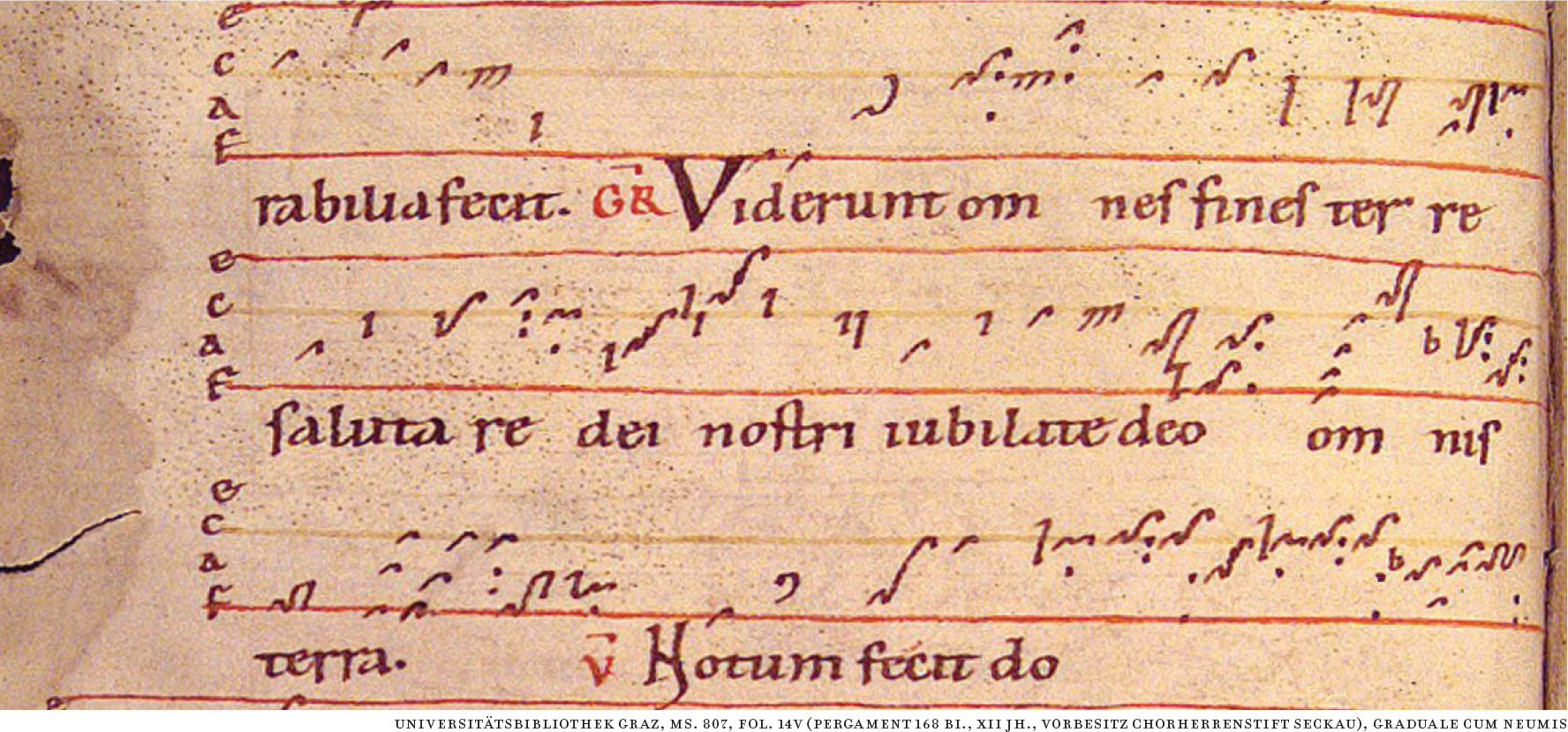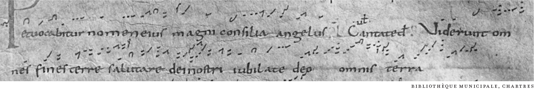 Notation developed through a series of innovations, each of which made the melodic outline more precise. The significant historical steps are shown in Figures 2.6–2.8, with modern equivalents in Examples 2.2–2.3. All show the Gradual Viderunt omnes from the Mass for Christmas Day (NAWM 3d).