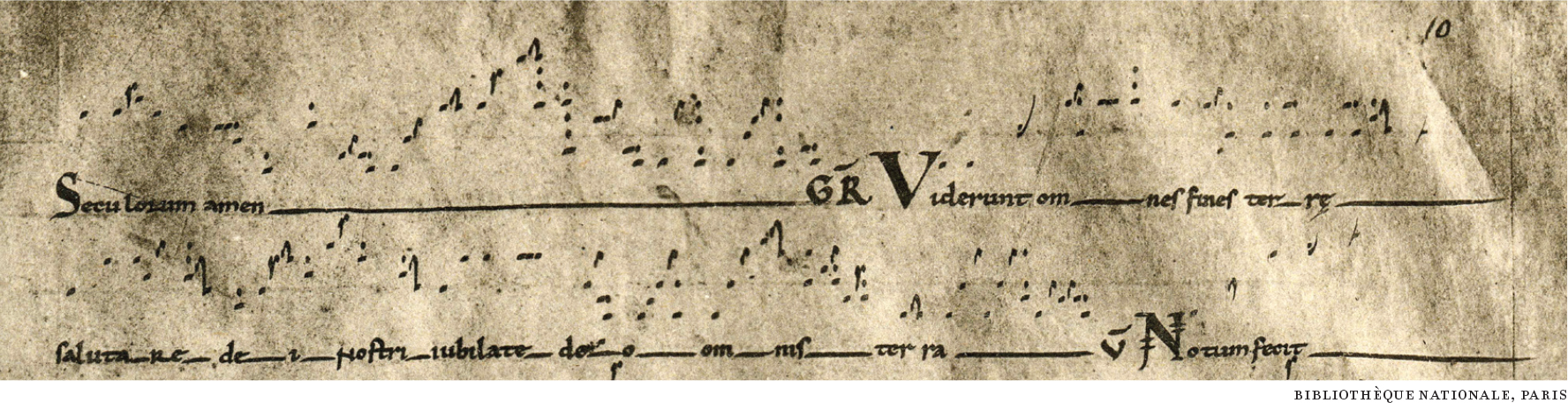 ) indicates three notes, so that “terrae” begins c′–a–c′. Diamond-shaped notes appear in descending patterns, as on “omnes,” as a way to save space; they may receive the same values as square ones, although their name (currentes, meaning “running”) suggests some quickening. The small notes indicate partially closing the mouth on a voiced consonant at the end of a syllable, as on the “n” in “Viderunt” in the first staff. The wavy line in ascending figures (