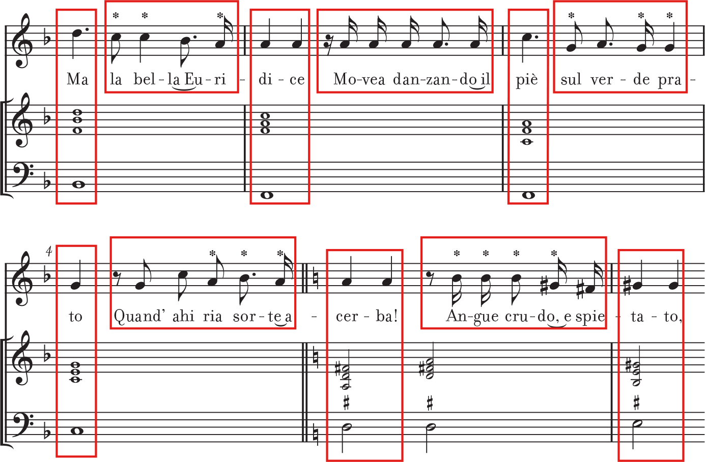 Example 14.1 shows how Peri followed his own prescription for the new style. The vertical boxes identify the syllables that are sustained or accented in speech and the consonant harmonies that support them. The horizontal boxes contain the syllables that are passed over quickly in speech and may be set with either dissonances (marked by asterisks) or consonances against the bass and its implied chords. The ways dissonances are introduced and left often violate the rules of counterpoint, but the effort to imitate speech exempts these notes from normal musical conventions. This combination of speechlike freedom and sustained, harmonized accented syllables realized Peri’s idea of a medium halfway between speech and song.
