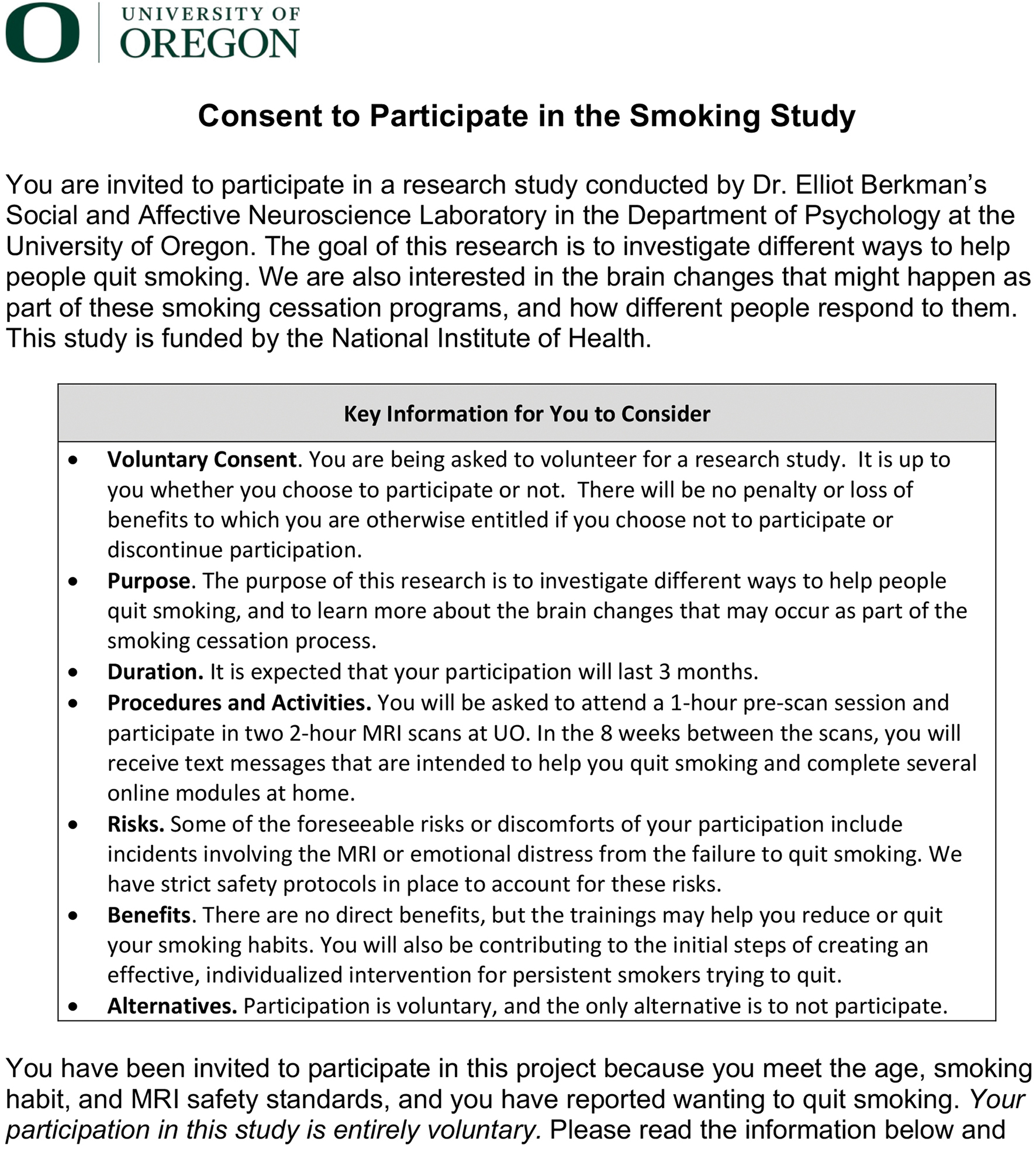 This portion of an approved form gives you a sense of how researchers typically obtain informed consent in writing.
