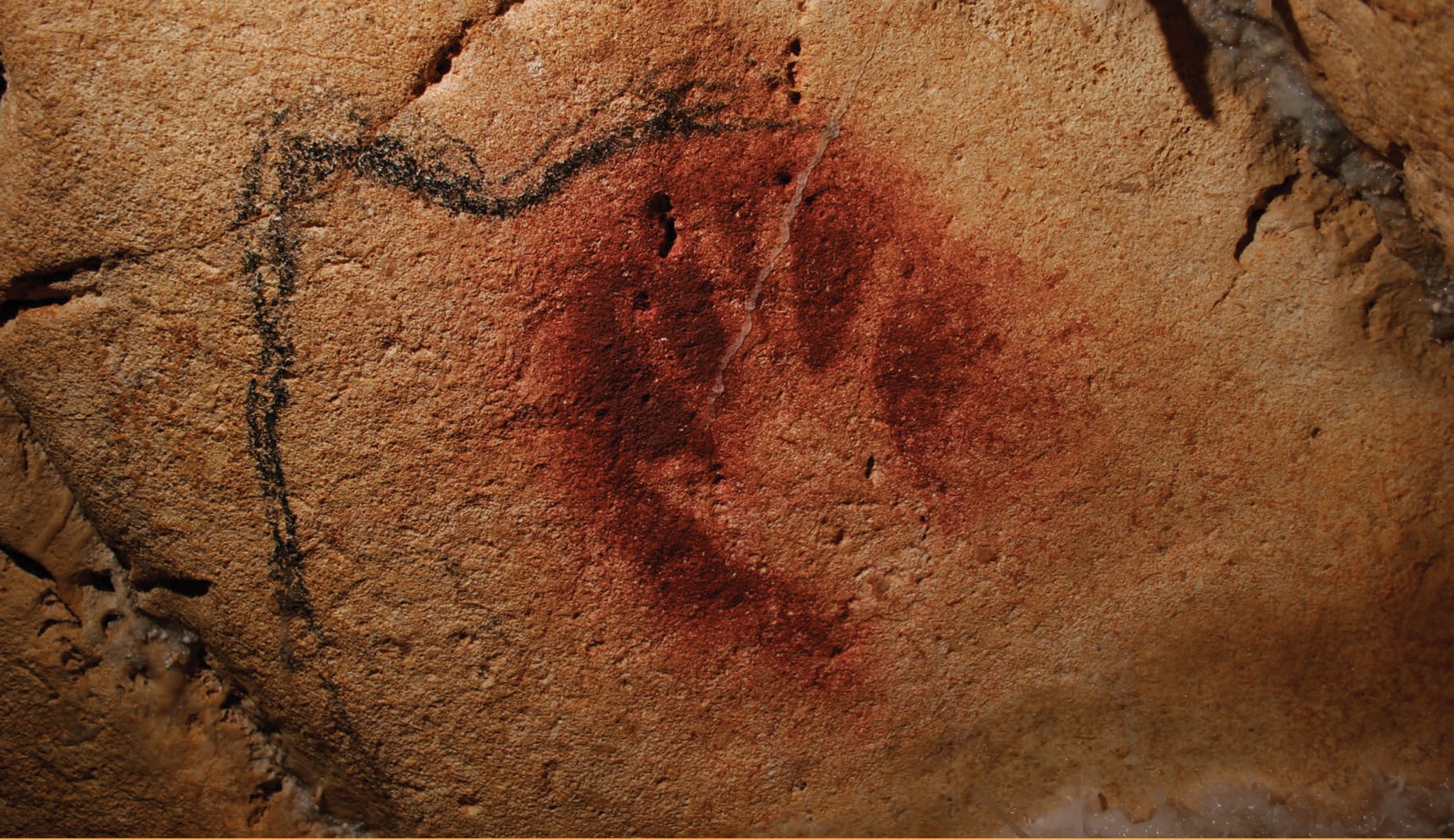 Human Culture A human hand outlined in red pigment decorates the wall of a cave in France, alongside vivid images (not shown) of animals such as mammoths and rhinos. Perhaps serving as the artist’s signature, the hand image dates from 36,000 years ago—evidence of the explosion in culture that humans throughout the world experienced during the late Paleolithic period.CHRONOLOGYOPENCLOSE