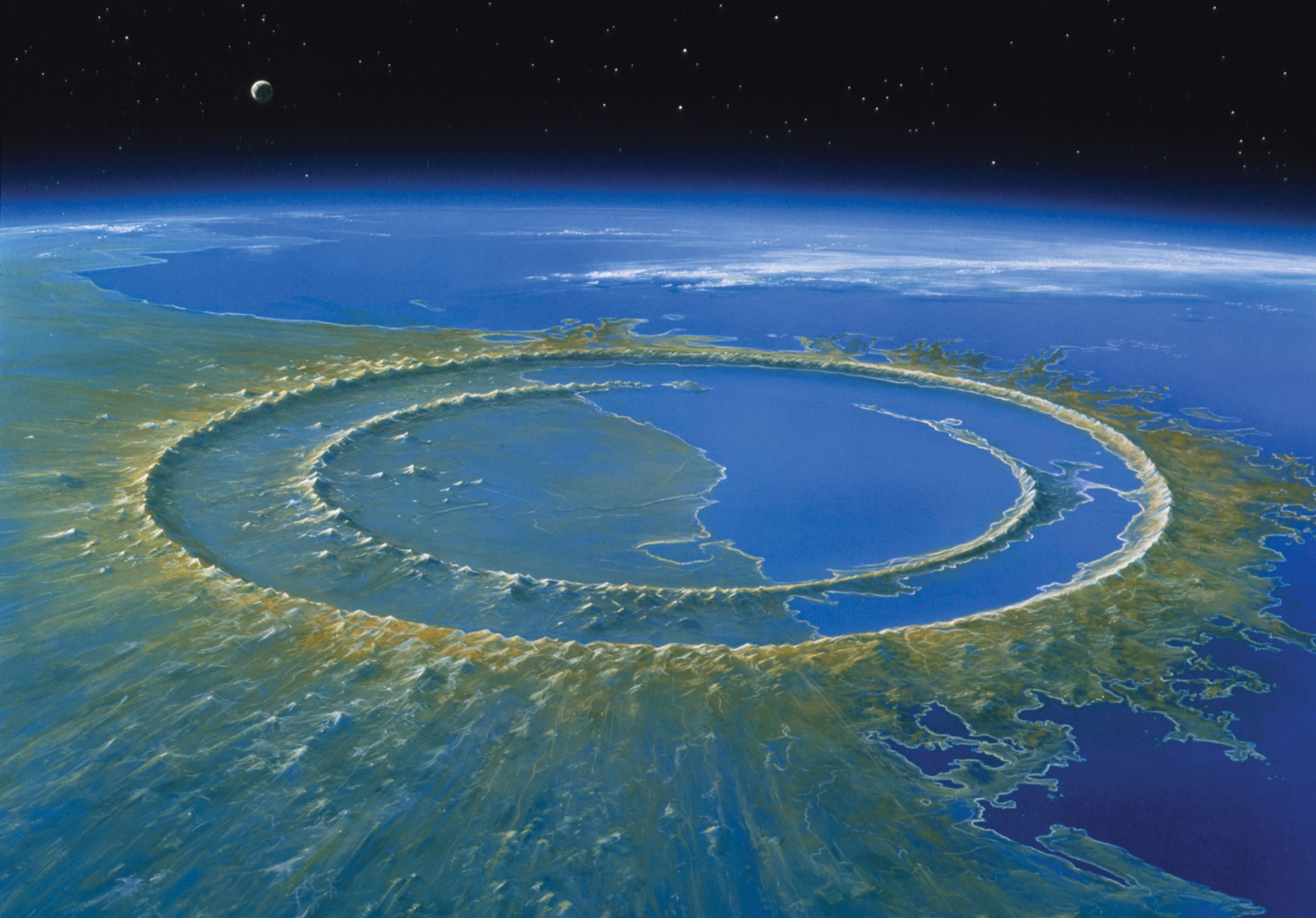 Life anywhere on Earth was risky business. Every now and then an asteroid, meteorite, or something else hurtling through space smashed into the planet. Volcanoes rumbled and belched forth fire and toxic gases. The continents slid here and there, slowly crunching into one another, opening and closing seas and raising mountain chains. As a result of these and other hazards, large proportions of life on Earth went extinct on five occasions. Whenever this happened, biological evolution took new directions. On the last such occasion, when an asteroid slammed into the northwestern Yucatán Peninsula in Mexico about 66 million years ago, the shock from its impact opened a crater the size of Belgium or Maryland. It ignited fires that consumed much of the planet’s vegetation, and it raised a veil of dust that blocked sunlight and chilled the Earth. All land animals bigger than a medium-sized dog went extinct, including all dinosaurs and most other reptiles. The meek inherited the Earth. Among the meek were small mammals, such as the ancient tree shrew that is our ancestor.