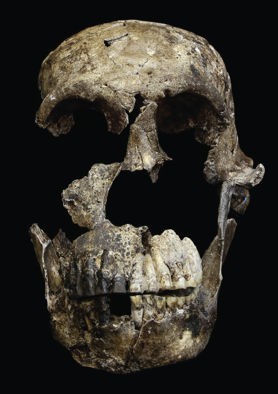 In 2013, paleontologists began excavating nineteen hominin skeletons from the Rising Star cave in South Africa. The reconstructed skull of the most complete skeleton, named Neo by the scientists, is shown here. At an estimated 100 lbs. (45 kg) and 4′10″ (1.2 m) in height, Neo was shorter than modern humans and had a much smaller brain—closer in size to the brains of Australopithecus afarensis like Lucy than hominins in our genus, Homo. Yet his brain was shaped more like ours, suggesting that he may have been able to use language. His hands, legs, and feet suggest that he was fully bipedal, but scientists usually link the shape of his hips and curved fingers with species from millions of years ago. So it was surprising when scientists confirmed that Neo lived 300,000 years ago, about the same time that our Homo sapiens ancestors first appeared in Africa. It’s possible that Neo’s species, Homo naledi, encountered early Homo sapiens, as our cousins the Neanderthals and Denisovans did.
