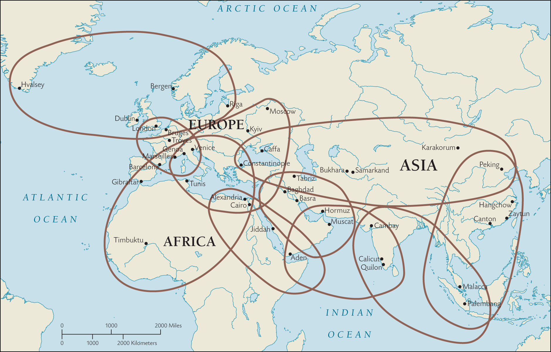 In our long-term survey of Western civilizations, we have frequently noted the existence of strong links between the Mediterranean world and the Far East. Trade along the network of trails known as the Silk Road can be traced far back into antiquity, and we have seen that such overland networks were extended by Europe’s waterways and by the sea. But it was not until the late thirteenth century that Europeans were able to establish direct connections with India, China, and the so-called Spice Islands of the Indonesian archipelago. For Europeans, these connections would prove profoundly important, as much for their impact on the European imagination as for their economic significance. For the peoples of Asia, however, the more frequent appearance of Europeans was less consequential than the events that made these journeys possible: the rise of a new empire that encompassed the entire continent.