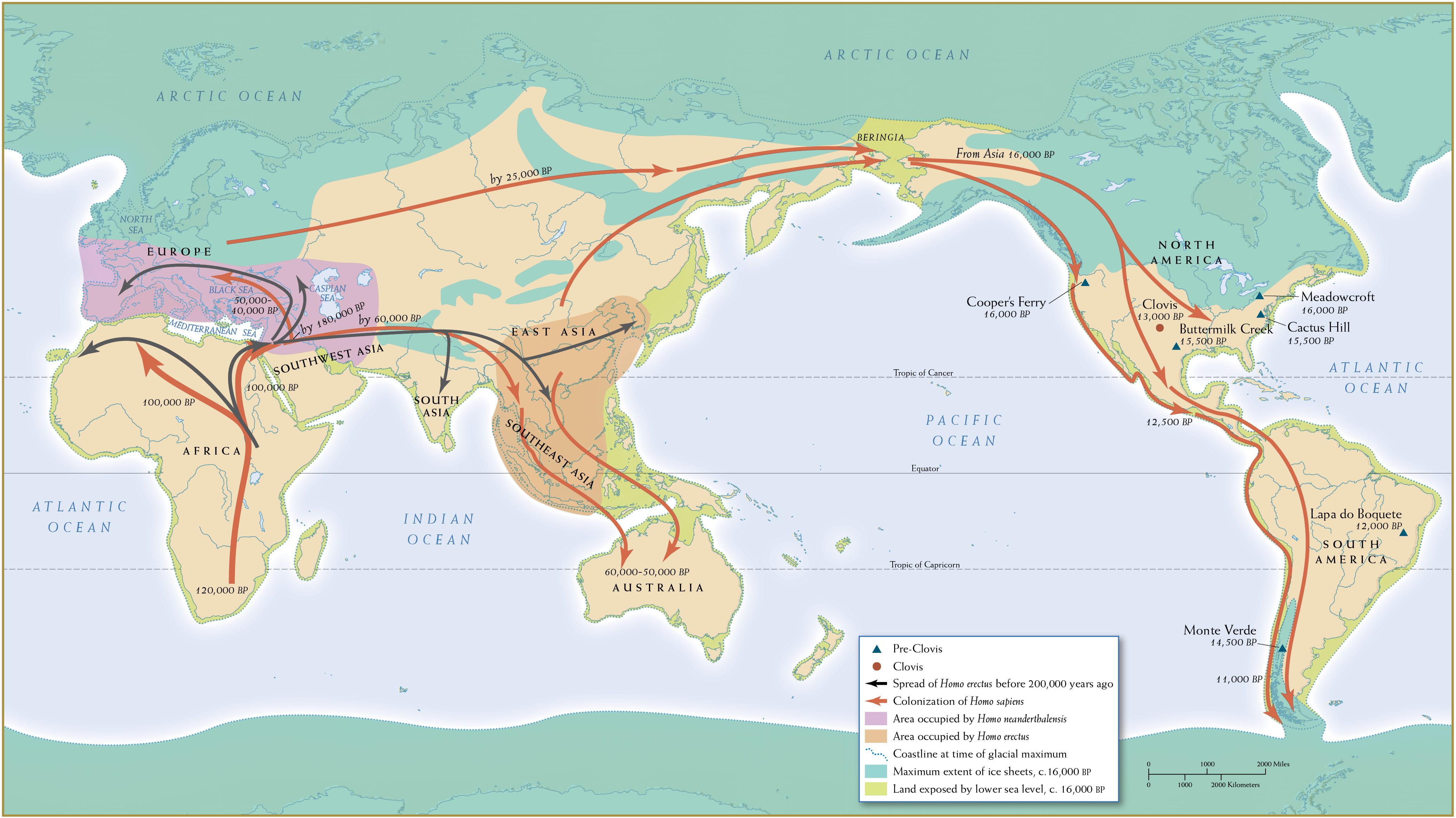 About 30,000 years ago, Homo sapiens began edging into the weedy landmass that linked Siberia and North America (which hominins had not populated). This thousand-mile-long land bridge, later called Beringia, must have seemed like an extension of familiar steppe-land terrain, and these individuals lived isolated lives there on a broad and (at the time) warm plain for thousands of years before beginning to migrate into North America. The first migrations occurred around 16,000 years ago, by foot and by boat. Modern humans poured eastward and southward into North America. A final migration occurred about 8,000 years ago by boat, since by then the land bridge had disappeared under the sea. (See Map 1.2 for evidence that demonstrates the complex picture of the peopling of the Americas, both along the western coastline and to the east.)