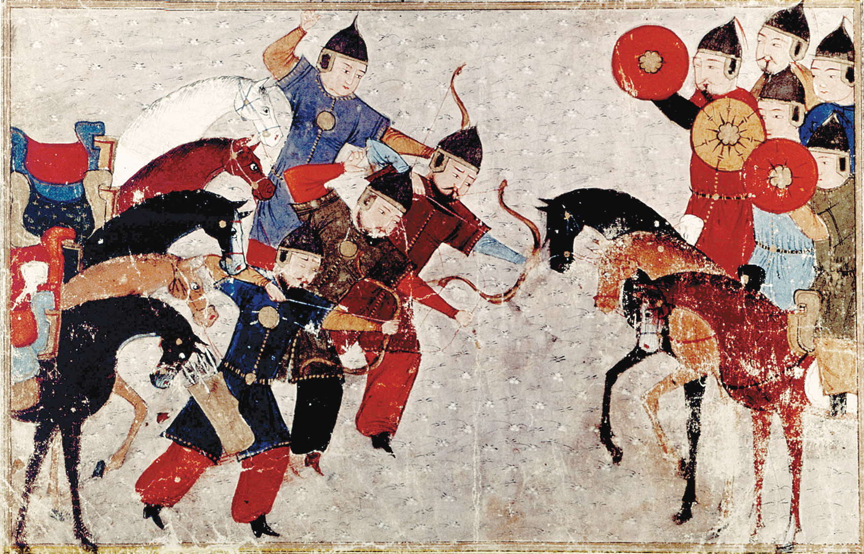Wielding heavy compound bows made of sinew, wood, and horn, Mongol archers were deadly accurate at over 200 yards—even at full gallop. Their small but sturdy horses, capable of withstanding extreme cold, bore saddles with high supports in front and back, enabling the warriors to maneuver at high speeds. With their feet secure in iron stirrups, the archers could rise in their saddles to aim their arrows without stopping. These expert horsemen often remained in the saddle all day and night, even sleeping while their horses continued on. Each warrior kept many horses, replacing tired mounts with fresh ones so that the armies could cover up to 70 miles per day.